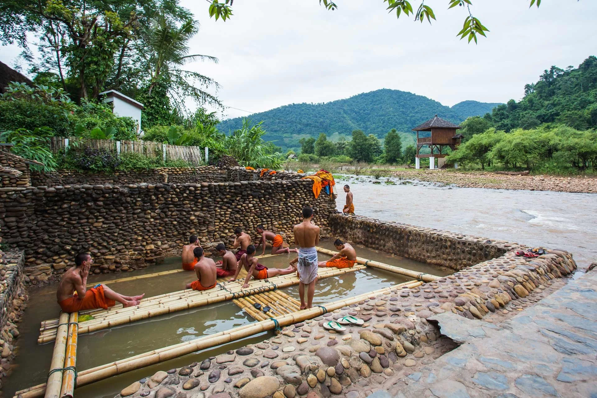 The springs are located directly at the base of Muang La Resort, on the river beside the hotel’s wooden suspension bridge. Take the stairway beside the resort wall and follow the narrow path to the banks.