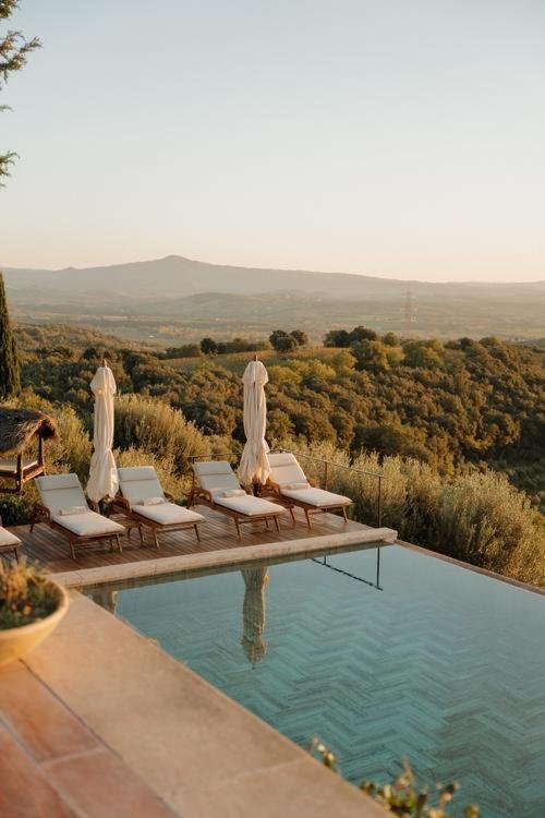 Located near the border of Lazio and Tuscany, this resort is built on an ancient Etruscan site. It features four large pools that blend into the olive groves.