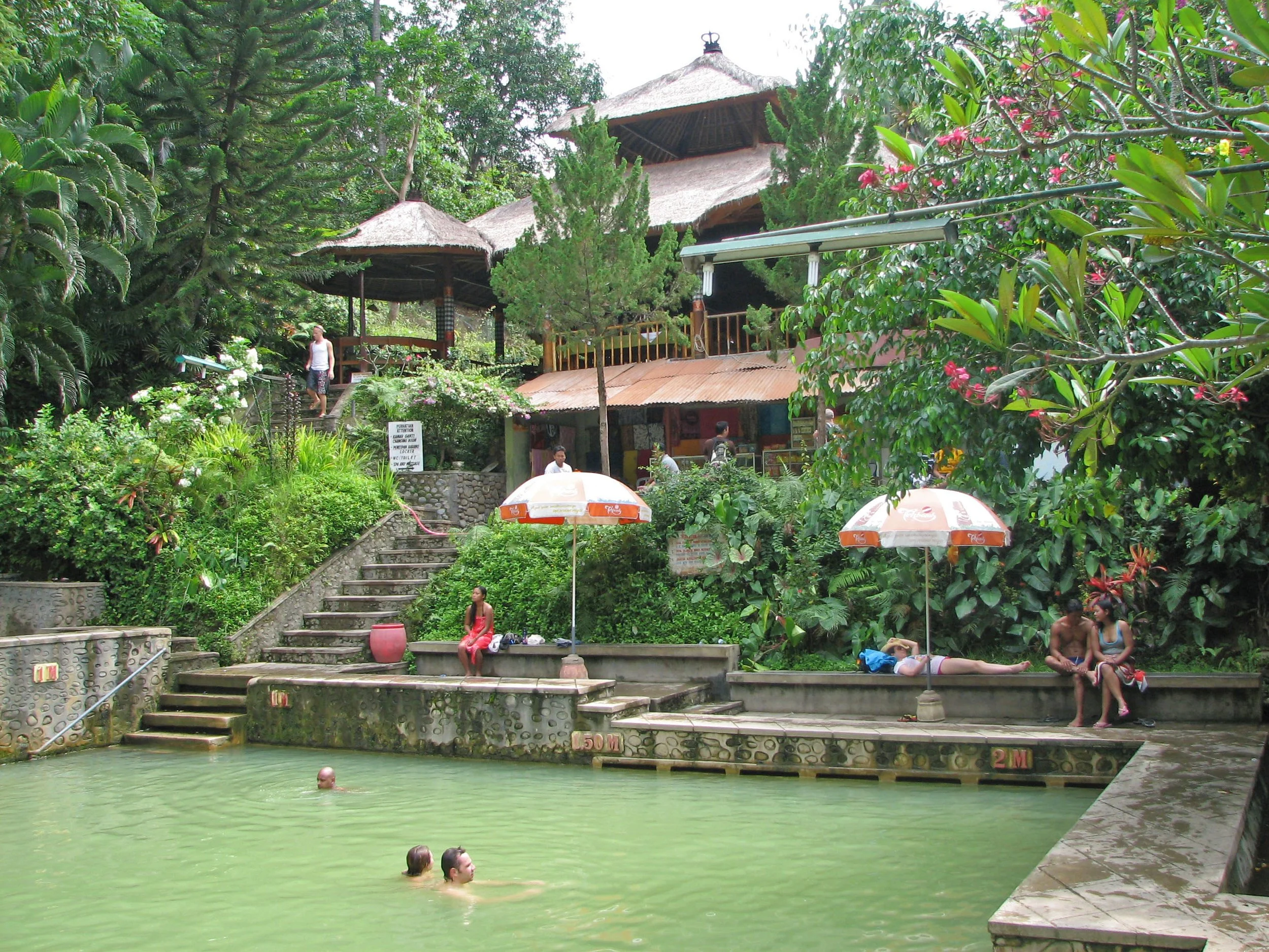The hot water springs complex comprises four main pool sections, with the largest and central bathing pool featuring a restaurant perched high above the northern side.